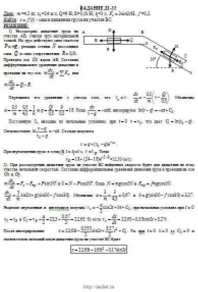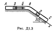 Груз D массой m, получив в точке A начальную скорость v0 движется в изогнутой трубе AВС, расположенной в вертикальной плоскости; участки трубы или оба наклонные, или один горизонтальный, а другой наклонный (рис. Д1.0 — Д1.9, табл. Д1). На участке AВ на груз кроме силы тяжести действуют постоянная сила Q (ее направление показано на рисунках) и сила сопротивления среды R, зависящая от скорости v груза (направлена против движения); трением груза о трубу на участке AВ пренебречь. В точке В груз, не изменяя своей скорости, переходит на участок ВС трубы, где на него кроме силы тяжести действуют сила трения (коэффициент трения груза о трубу f = 0,2) и переменная сила F, проекция которой Fx на ось х задана в таблице. Считая груз материальной точкой и зная расстояние AВ = l или время t1 движения груза от точки А до точки В, найти закон движения груза на участке ВС, т. е. х = f(t), где х = BD.