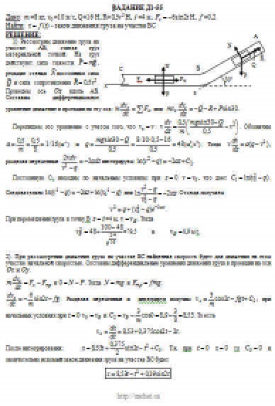 Груз D массой m, получив в точке A начальную скорость v0 движется в изогнутой трубе AВС, расположенной в вертикальной плоскости; участки трубы или оба наклонные, или один горизонтальный, а другой наклонный (рис. Д1.0 — Д1.9, табл. Д1). На участке AВ на груз кроме силы тяжести действуют постоянная сила Q (ее направление показано на рисунках) и сила сопротивления среды R, зависящая от скорости v груза (направлена против движения); трением груза о трубу на участке AВ пренебречь. В точке В груз, не изменяя своей скорости, переходит на участок ВС трубы, где на него кроме силы тяжести действуют сила трения (коэффициент трения груза о трубу f = 0,2) и переменная сила F, проекция которой Fx на ось х задана в таблице. Считая груз материальной точкой и зная расстояние AВ = l или время t1 движения груза от точки А до точки В, найти закон движения груза на участке ВС, т. е. х = f(t), где х = BD.