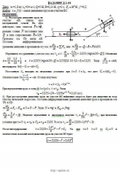 Груз D массой m, получив в точке A начальную скорость v0 движется в изогнутой трубе AВС, расположенной в вертикальной плоскости; участки трубы или оба наклонные, или один горизонтальный, а другой наклонный (рис. Д1.0 — Д1.9, табл. Д1). На участке AВ на груз кроме силы тяжести действуют постоянная сила Q (ее направление показано на рисунках) и сила сопротивления среды R, зависящая от скорости v груза (направлена против движения); трением груза о трубу на участке AВ пренебречь. В точке В груз, не изменяя своей скорости, переходит на участок ВС трубы, где на него кроме силы тяжести действуют сила трения (коэффициент трения груза о трубу f = 0,2) и переменная сила F, проекция которой Fx на ось х задана в таблице. Считая груз материальной точкой и зная расстояние AВ = l или время t1 движения груза от точки А до точки В, найти закон движения груза на участке ВС, т. е. х = f(t), где х = BD.