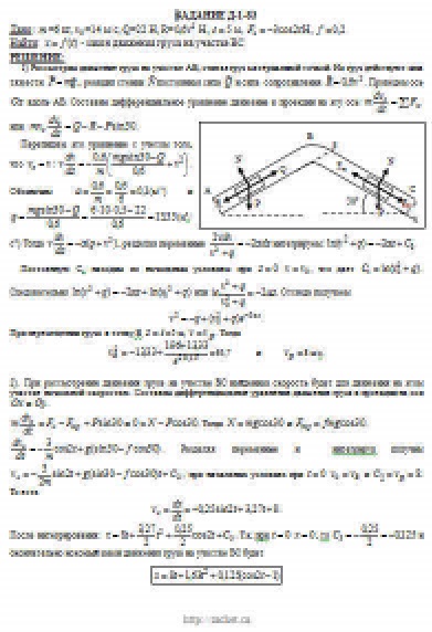 Груз D массой m, получив в точке A начальную скорость v0 движется в изогнутой трубе AВС, расположенной в вертикальной плоскости; участки трубы или оба наклонные, или один горизонтальный, а другой наклонный (рис. Д1.0 — Д1.9, табл. Д1). На участке AВ на груз кроме силы тяжести действуют постоянная сила Q (ее направление показано на рисунках) и сила сопротивления среды R, зависящая от скорости v груза (направлена против движения); трением груза о трубу на участке AВ пренебречь. В точке В груз, не изменяя своей скорости, переходит на участок ВС трубы, где на него кроме силы тяжести действуют сила трения (коэффициент трения груза о трубу f = 0,2) и переменная сила F, проекция которой Fx на ось х задана в таблице. Считая груз материальной точкой и зная расстояние AВ = l или время t1 движения груза от точки А до точки В, найти закон движения груза на участке ВС, т. е. х = f(t), где х = BD.