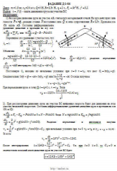 Груз D массой m, получив в точке A начальную скорость v0 движется в изогнутой трубе AВС, расположенной в вертикальной плоскости; участки трубы или оба наклонные, или один горизонтальный, а другой наклонный (рис. Д1.0 — Д1.9, табл. Д1). На участке AВ на груз кроме силы тяжести действуют постоянная сила Q (ее направление показано на рисунках) и сила сопротивления среды R, зависящая от скорости v груза (направлена против движения); трением груза о трубу на участке AВ пренебречь. В точке В груз, не изменяя своей скорости, переходит на участок ВС трубы, где на него кроме силы тяжести действуют сила трения (коэффициент трения груза о трубу f = 0,2) и переменная сила F, проекция которой Fx на ось х задана в таблице. Считая груз материальной точкой и зная расстояние AВ = l или время t1 движения груза от точки А до точки В, найти закон движения груза на участке ВС, т. е. х = f(t), где х = BD.