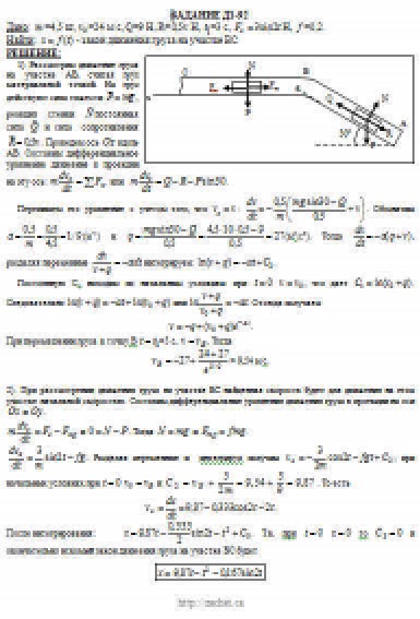 Груз D массой m, получив в точке A начальную скорость v0 движется в изогнутой трубе AВС, расположенной в вертикальной плоскости; участки трубы или оба наклонные, или один горизонтальный, а другой наклонный (рис. Д1.0 — Д1.9, табл. Д1). На участке AВ на груз кроме силы тяжести действуют постоянная сила Q (ее направление показано на рисунках) и сила сопротивления среды R, зависящая от скорости v груза (направлена против движения); трением груза о трубу на участке AВ пренебречь. В точке В груз, не изменяя своей скорости, переходит на участок ВС трубы, где на него кроме силы тяжести действуют сила трения (коэффициент трения груза о трубу f = 0,2) и переменная сила F, проекция которой Fx на ось х задана в таблице. Считая груз материальной точкой и зная расстояние AВ = l или время t1 движения груза от точки А до точки В, найти закон движения груза на участке ВС, т. е. х = f(t), где х = BD.