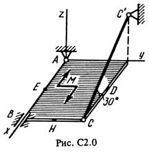Однородная прямоугольная плита весом P = 5 кН со сторонами AB = 3l, BC = 2l закреплена в точке А сферическим шарниром (подшипником) и удерживается в равновесии невесомым стержнем CC´ (рис. С2.0 – С2.9). На плиту действуют пара сил с моментом M = 6 кН·м, лежащая в плоскости плиты, и две силы. Значения этих сил, их направления и точки приложения указаны в табл. С2; при этом силы F1 и F4 лежат в плоскостях, параллельных плоскости xy, сила F2 – в плоскости, параллельной xz, сила F3 – в плоскости, параллельной yz. Точки приложения сил (D, E, H) находятся в серединах сторон плиты. Определить реакции связей в точках A, B и C. При подсчетах принять l = 0,8 м.