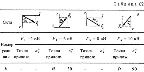 Однородная прямоугольная плита весом P = 5 кН со сторонами AB = 3l, BC = 2l закреплена в точке А сферическим шарниром (подшипником) и удерживается в равновесии невесомым стержнем CC´ (рис. С2.0 – С2.9). На плиту действуют пара сил с моментом M = 6 кН·м, лежащая в плоскости плиты, и две силы. Значения этих сил, их направления и точки приложения указаны в табл. С2; при этом силы F1 и F4 лежат в плоскостях, параллельных плоскости xy, сила F2 – в плоскости, параллельной xz, сила F3 – в плоскости, параллельной yz. Точки приложения сил (D, E, H) находятся в серединах сторон плиты. Определить реакции связей в точках A, B и C. При подсчетах принять l = 0,8 м.