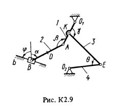 Плоский механизм состоит из стержней 1 – 4 и ползуна B, соединенных друг с другом и с неподвижными опорами O1 и O2 шарнирами (рис. К2.0-К2.9). Длины стержней: l1 = 0,4 м, l2 = 1,2 м, l3 = 1,4 м, l4 = 0,8 м. Положение механизма определяется углами α, β, γ, φ, θ, которые вместе с другими величинами заданы в табл. К2. Точка D на всех рисунках и точка К на рис. К2.7-К2.9 в середине соответствующего стержня. Определить величины, указанные в таблице в столбце «Найти». Найти также ускорение aA точки А стержня 1, если стержень 1 имеет в данный момент времени угловое ускорение ε1 = 10 с-2 Дуговые стрелки на рисунках показывают, как при построении чертежа должны откладываться соответствующие углы, т.е. по ходу или против хода часовой стрелки (например, угол γ на рис. 1 следует отложить от стержня DE против хода часовой стрелки, а на рис. 2 – от стержня AE по ходу часовой стрелки). Построение чертежа начинать со стержня, направление которого определяется углом α; ползун В и его направляющие для большей наглядности изобразить, как в примере К2 (см. рис. К2). Заданную угловую скорость считать направленной против хода часовой стрелки, а заданную скорость vB – от точки В к b.