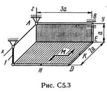 Две однородные прямоугольные тонкие плиты жестко соединены (сварены) под прямым углом друг к другу и закреплены сферическим шарниром (или подпятником) в точке А, цилиндрическим шарниром (подшипником) в точке В и невесомым стержнем 1 (рис. С5.0 — С5.7) или же двумя подшипниками в точках A и В и двумя невесомыми стержнями 1 и 2 (рис. С5.8, С5.9); все стержни прикреплены к плитам и к неподвижным опорам шарнирами.