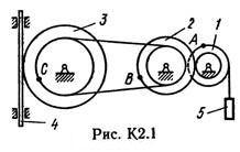 Механизм состоит из ступенчатых колес 1—3, находящихся в зацеплении или связанных ременной передачей, зубчатой рейки 4 и груза 5, привязанного к концу нити, намотанной на одно из колес (рис. К2.0 — К2.9, табл. К2). Радиусы ступеней колес равны соответственно: у колеса 1 – r1 = 2 см, R1 = 4 см, у колеса 2 – r2 = 6 см, R2 = 8 см, у колеса 3 – r3 — 12 см, R3 = 16 см. На ободьях колес расположены точки A, В и С.
