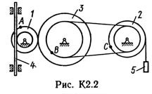 Механизм состоит из ступенчатых колес 1—3, находящихся в зацеплении или связанных ременной передачей, зубчатой рейки 4 и груза 5, привязанного к концу нити, намотанной на одно из колес (рис. К2.0 — К2.9, табл. К2). Радиусы ступеней колес равны соответственно: у колеса 1 – r1 = 2 см, R1 = 4 см, у колеса 2 – r2 = 6 см, R2 = 8 см, у колеса 3 – r3 — 12 см, R3 = 16 см. На ободьях колес расположены точки A, В и С.