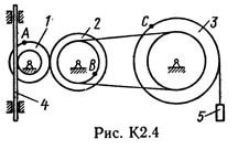 Механизм состоит из ступенчатых колес 1—3, находящихся в зацеплении или связанных ременной передачей, зубчатой рейки 4 и груза 5, привязанного к концу нити, намотанной на одно из колес (рис. К2.0 — К2.9, табл. К2). Радиусы ступеней колес равны соответственно: у колеса 1 – r1 = 2 см, R1 = 4 см, у колеса 2 – r2 = 6 см, R2 = 8 см, у колеса 3 – r3 — 12 см, R3 = 16 см. На ободьях колес расположены точки A, В и С.