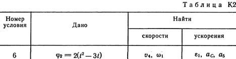 В столбце «Дано» таблицы указан закон движения или закон изменения скорости ведущего звена механизма, где φ1(t) — закон вращения колеса 1, s2(t) — закон движения рейки 4, ε2(t); — закон изменения угловой скорости колеса 2, v5(t) — закон изменения скорости груза 5 и т. д. (везде φ выражено в радианах, s — в сантиметрах, t — в секундах). Положительное направление для φ и ω против хода часовой стрелки, для s4, s5 и v4, v5 — вниз.