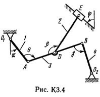 Плоский механизм состоит из стержней 1, 2, 3, 4 и ползуна В или Е (рис. КЗ.0 — К3.7) или из стержней 1, 2, 3 и ползунов В и E (рис. К3.8, К3.9), соединенных друг с другом и с неподвижными опорами O1, O2 шарнирами; точка D находится в середине стержня АВ. Длины стержней равны соответственно l1 = 0,4 м, l2 = 1,2 м, l3 = 1,4 м, l4 = 0,6 м. Положение механизма определяется углами α, β, γ, φ, θ. Значения этих углов и других заданных величин указаны в табл. КЗа (для рис. 0—4) или в табл. КЗб (для рис. 5—9); при этом в табл. КЗа ω1 и ω4 — величины постоянные.