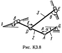 Плоский механизм состоит из стержней 1, 2, 3, 4 и ползуна В или Е (рис. КЗ.0 — К3.7) или из стержней 1, 2, 3 и ползунов В и E (рис. К3.8, К3.9), соединенных друг с другом и с неподвижными опорами O1, O2 шарнирами; точка D находится в середине стержня АВ. Длины стержней равны соответственно l1 = 0,4 м, l2 = 1,2 м, l3 = 1,4 м, l4 = 0,6 м. Положение механизма определяется углами α, β, γ, φ, θ. Значения этих углов и других заданных величин указаны в табл. КЗа (для рис. 0—4) или в табл. КЗб (для рис. 5—9); при этом в табл. КЗа ω1 и ω4 — величины постоянные.