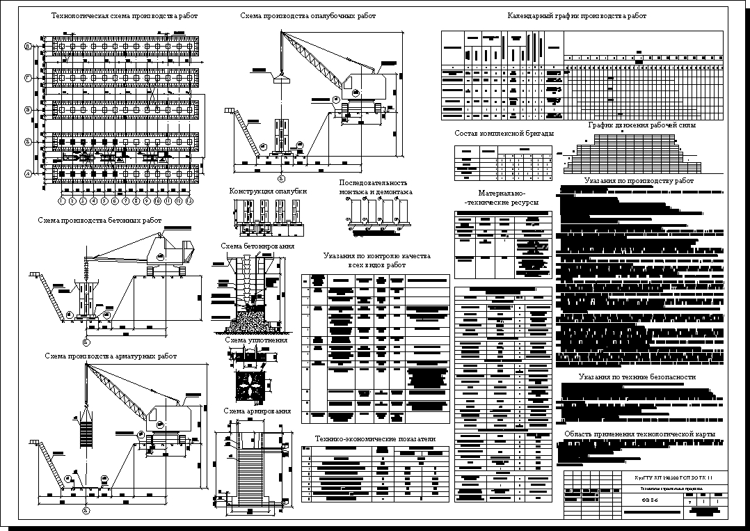 Графическая часть: Технологическая схема производства работ, Схема производства опалубочных работ, Календарный график производства работ, График движения рабочей силы, Состав комплексной бригады, Конструкция опалубки, Последовательность монтажа и демонтажа, Схема бетонирования, Указания по контролю качества всех видов работ, Схема уплотнения, Схема армирования, Схема производства бетонных работ, Схема производства арматурных работ Технико-экономические показатели, Материально-технические ресурсы, Указания по производству работ, Указания по технике безопасности, Область применения технологической карты