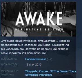 AWAKE получил награду за вступление на Adventure Jam 2016 и был значительно доработан для его окончательного издания. За тобой охотится убийца, и все происходит снова и снова. Вы застряли в петле времени - сможете ли вы выбраться?