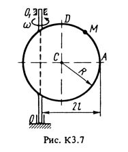Прямоугольная пластина (рис. К3.0-К3.5) или круглая пластина радиусом R = 60 см (рис. К3.6-К3.9) вращается вокруг неподвижной оси с постоянной угловой скоростью ω, заданной в табл. К3 (при знаке минус направление ω противоположно показанному на рисунке). Ось вращения на рис. К3.0-К3.3 и К3.8, К3.9 перпендикулярна плоскости пластины и проходит через точку О (пластина вращается в своей плоскости); на рис. К3.4-К3.7 ось вращения ОО1 лежит в плоскости пластины (пластина вращается в пространстве). По пластине вдоль прямой BD (рис. К3.0-К3.5) или по окружности радиуса R, т. е. по ободу пластины (рис. К3.6-К3.9), движется точка М. Закон ее относительного движения, выражаемый уравнением s = AM = f(t) (s – в сантиметрах, t – в секундах), задан в табл. К3 отдельно для рис. К3.0-К3.5 и для рис. К3.6-К3.9,при этом на рис. 6-9 s = AM и отсчитывается по дуге окружности; там же даны размеры b и l. На всех рисунках точка М показаны в положении, при котором s = AM > 0 (при s < 0 точка М находится по другую сторону от точки A). Определить абсолютную скорость и абсолютное ускорение точки М в момент времени t1 = 1 с.