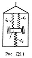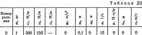 Груз 1 массой m укреплен на пружинной подвеске в лифте (рис. Д2.0 — Д2.9, табл. Д2). Лифт движется вертикально по закону z = 0,5α1t2 + α2sin(ωt) + α3cos(ωt) (ось z направлена по вертикали вверх; z выражено в метрах, t — в секундах). На груз действует сила сопротивления среды R = μv, где v — скорость груза по отношению к лифту. Найти закон движения груза по отношению к лифту, т. е. х = f(t); начало координат поместить в точке, где находится прикрепленный к грузу конец пружины, когда пружина не деформирована. При этом во избежание ошибок в знаках направить ось х в сторону удлинения пружины, а груз изобразить в положении, при котором х>0, т.е. пружина растянута. При подсчетах можно принять g = 10 м/с2. Массой пружин и соединительной планки 2 пренебречь. В таблице обозначено: c1, с2, c3 — коэффициенты жесткости пружин, λ0 — удлинение пружины с эквивалентной жесткостью в начальный момент времени t = 0, v0 — начальная скорость груза по отношению к лифту (направлена вертикально вверх). Прочерк в столбцах c1, с2, c3 означает, что соответствующая пружина отсутствует и на чертеже изображаться не должна. Если при этом конец одной из оставшихся пружин окажется свободным, его следует прикрепить в соответствующем месте или к грузу или к потолку (полу) лифта; то же следует сделать, если свободными окажутся соединенные планкой 2 концы обеих оставшихся пружин. Условие μ = 0 означает, что сила сопротивления R отсутствует.