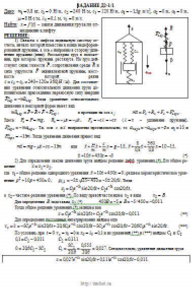 Груз 1 массой m укреплен на пружинной подвеске в лифте (рис. Д2.0 — Д2.9, табл. Д2). Лифт движется вертикально по закону z = 0,5α1t2 + α2sin(ωt) + α3cos(ωt) (ось z направлена по вертикали вверх; z выражено в метрах, t — в секундах). На груз действует сила сопротивления среды R = μv, где v — скорость груза по отношению к лифту. Найти закон движения груза по отношению к лифту, т. е. х = f(t); начало координат поместить в точке, где находится прикрепленный к грузу конец пружины, когда пружина не деформирована. При этом во избежание ошибок в знаках направить ось х в сторону удлинения пружины, а груз изобразить в положении, при котором х>0, т.е. пружина растянута. При подсчетах можно принять g = 10 м/с2. Массой пружин и соединительной планки 2 пренебречь. В таблице обозначено: c1, с2, c3 — коэффициенты жесткости пружин, λ0 — удлинение пружины с эквивалентной жесткостью в начальный момент времени t = 0, v0 — начальная скорость груза по отношению к лифту (направлена вертикально вверх). Прочерк в столбцах c1, с2, c3 означает, что соответствующая пружина отсутствует и на чертеже изображаться не должна. Если при этом конец одной из оставшихся пружин окажется свободным, его следует прикрепить в соответствующем месте или к грузу или к потолку (полу) лифта; то же следует сделать, если свободными окажутся соединенные планкой 2 концы обеих оставшихся пружин. Условие μ = 0 означает, что сила сопротивления R отсутствует.