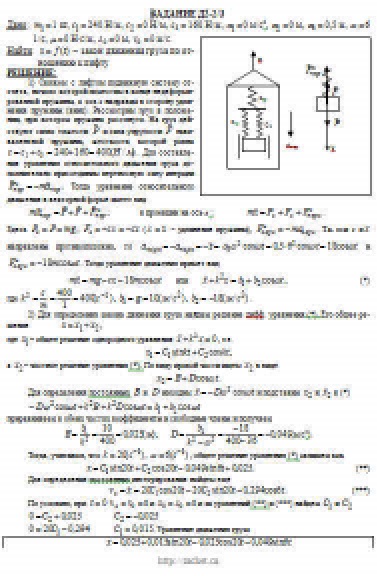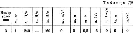 Груз 1 массой m укреплен на пружинной подвеске в лифте (рис. Д2.0 — Д2.9, табл. Д2). Лифт движется вертикально по закону z = 0,5α1t2 + α2sin(ωt) + α3cos(ωt) (ось z направлена по вертикали вверх; z выражено в метрах, t — в секундах). На груз действует сила сопротивления среды R = μv, где v — скорость груза по отношению к лифту. Найти закон движения груза по отношению к лифту, т. е. х = f(t); начало координат поместить в точке, где находится прикрепленный к грузу конец пружины, когда пружина не деформирована. При этом во избежание ошибок в знаках направить ось х в сторону удлинения пружины, а груз изобразить в положении, при котором х>0, т.е. пружина растянута. При подсчетах можно принять g = 10 м/с2. Массой пружин и соединительной планки 2 пренебречь. В таблице обозначено: c1, с2, c3 — коэффициенты жесткости пружин, λ0 — удлинение пружины с эквивалентной жесткостью в начальный момент времени t = 0, v0 — начальная скорость груза по отношению к лифту (направлена вертикально вверх). Прочерк в столбцах c1, с2, c3 означает, что соответствующая пружина отсутствует и на чертеже изображаться не должна. Если при этом конец одной из оставшихся пружин окажется свободным, его следует прикрепить в соответствующем месте или к грузу или к потолку (полу) лифта; то же следует сделать, если свободными окажутся соединенные планкой 2 концы обеих оставшихся пружин. Условие μ = 0 означает, что сила сопротивления R отсутствует.