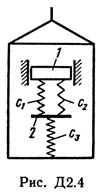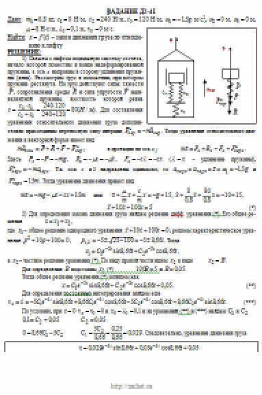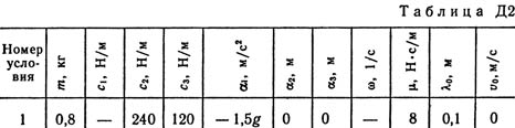 Груз 1 массой m укреплен на пружинной подвеске в лифте (рис. Д2.0 — Д2.9, табл. Д2). Лифт движется вертикально по закону z = 0,5α1t2 + α2sin(ωt) + α3cos(ωt) (ось z направлена по вертикали вверх; z выражено в метрах, t — в секундах). На груз действует сила сопротивления среды R = μv, где v — скорость груза по отношению к лифту. Найти закон движения груза по отношению к лифту, т. е. х = f(t); начало координат поместить в точке, где находится прикрепленный к грузу конец пружины, когда пружина не деформирована. При этом во избежание ошибок в знаках направить ось х в сторону удлинения пружины, а груз изобразить в положении, при котором х>0, т.е. пружина растянута. При подсчетах можно принять g = 10 м/с2. Массой пружин и соединительной планки 2 пренебречь. В таблице обозначено: c1, с2, c3 — коэффициенты жесткости пружин, λ0 — удлинение пружины с эквивалентной жесткостью в начальный момент времени t = 0, v0 — начальная скорость груза по отношению к лифту (направлена вертикально вверх). Прочерк в столбцах c1, с2, c3 означает, что соответствующая пружина отсутствует и на чертеже изображаться не должна. Если при этом конец одной из оставшихся пружин окажется свободным, его следует прикрепить в соответствующем месте или к грузу или к потолку (полу) лифта; то же следует сделать, если свободными окажутся соединенные планкой 2 концы обеих оставшихся пружин. Условие μ = 0 означает, что сила сопротивления R отсутствует.