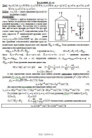 Груз 1 массой m укреплен на пружинной подвеске в лифте (рис. Д2.0 — Д2.9, табл. Д2). Лифт движется вертикально по закону z = 0,5α1t2 + α2sin(ωt) + α3cos(ωt) (ось z направлена по вертикали вверх; z выражено в метрах, t — в секундах). На груз действует сила сопротивления среды R = μv, где v — скорость груза по отношению к лифту. Найти закон движения груза по отношению к лифту, т. е. х = f(t); начало координат поместить в точке, где находится прикрепленный к грузу конец пружины, когда пружина не деформирована. При этом во избежание ошибок в знаках направить ось х в сторону удлинения пружины, а груз изобразить в положении, при котором х>0, т.е. пружина растянута. При подсчетах можно принять g = 10 м/с2. Массой пружин и соединительной планки 2 пренебречь. В таблице обозначено: c1, с2, c3 — коэффициенты жесткости пружин, λ0 — удлинение пружины с эквивалентной жесткостью в начальный момент времени t = 0, v0 — начальная скорость груза по отношению к лифту (направлена вертикально вверх). Прочерк в столбцах c1, с2, c3 означает, что соответствующая пружина отсутствует и на чертеже изображаться не должна. Если при этом конец одной из оставшихся пружин окажется свободным, его следует прикрепить в соответствующем месте или к грузу или к потолку (полу) лифта; то же следует сделать, если свободными окажутся соединенные планкой 2 концы обеих оставшихся пружин. Условие μ = 0 означает, что сила сопротивления R отсутствует.