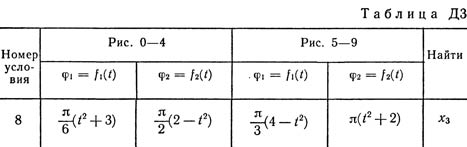 При движении грузов угол φ1 = ∠A2C3D1изменяется по закону φ1 = f1(t), а угол φ2 = ∠A2C3D2 — по закону φ2 = f2(t). В табл. ДЗ эти зависимости даны отдельно для рис. 0—4 и 5—9, где φ выражено в радианах, t — в секундах. Считая грузы материальными точками и пренебрегая всеми сопротивлениями, определить закон изменения со временем величины, указанной в таблице в столбце «Найти», т. е. x3 = t3(t) и N = f(t), где x3 — координата центра C3 плиты (зависимость x3 = f3(t) определяет закон движения плиты), N — полная нормальная реакция направляющих.