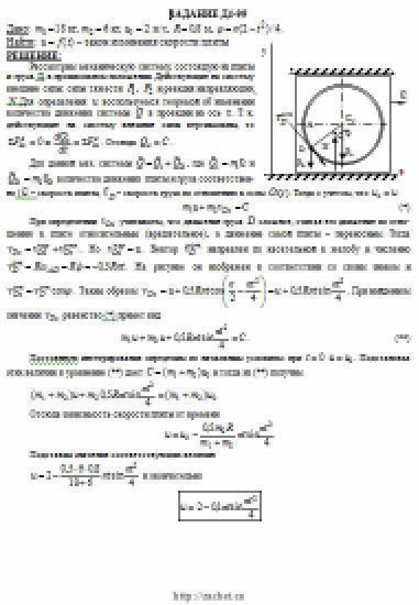 Механическая система состоит из прямоугольной вертикальной плиты 1 массой m1 = 18 кг, движущейся вдоль горизонтальных направляющих, и груза D массой m2 = 6 кг (рис. Д4.0 — Д4.9, табл. Д4). В момент времени t0 = 0, когда скорость плиты u0 = 2 м/с, груз под действием внутренних сил начинает двигаться по желобу плиты. На рис. 0—3 желоб КЕ прямолинейный и при движении груза расстояние s = AD изменяется по закону s = f1(t), а на рис. 4—9 желоб — окружность радиуса R = 0,8 м и при движении груза угол φ = ∟AC1D изменяется по закону ф = f2(t). В табл. Д4 эти зависимости даны отдельно для рис. 0 и 1, для рис. 2 и 3 и т. д., где s выражено в метрах, φ — в радианах» t — в секундах. Считая груз материальной точкой и пренебрегая всеми сопротивлениями, определить зависимость u = f(t), т. е. скорость плиты как функцию времени.