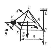 Однородная пирамида OABCD весом G = 60Н под действием пары сил с моментом М = 150Нм и наложенных связей находится в равновесии. Определить составляющую реак­ции шарнира B, параллельную оси Ох, если размер а = 3м, а пара сил лежит в плоскости Оху. (Ответ 50)