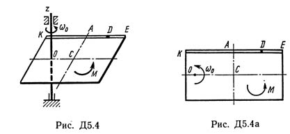 Однородная горизонтальная платформа (круглая радиуса R или прямоугольная со сторонами R и 2R, где R = 1,2 м) массой m1 = 24 кг вращается с угловой скоростью ω0 = 10 с-1 вокруг вертикальной оси z, отстоящей от центра масс C платформы на расстоянии OC = b (рис. Д5.0 —Д5.9, табл. Д5); размеры для всех прямоугольных платформ показаны на рис. Д5.0а (вид сверху). В момент времени t0 = 0 по желобу платформы начинает двигаться (под действием внутренних сил) груз D массой m2 = 8 кг по закону s = AD = F(t) где s выражено в метрах, t — в секундах. Одновременно на платформы начинает действовать пара сил с моментом М (задан в ньютонометрах; при М<0 его направление противоположно показанному на рисунках). Определить, пренебрегая массой вала, зависимость ω = f(t), т. е. угловую скорость платформы, как функцию времени. На всех рисунках груз D показан в положении, при котором s>0 (когда s<0, груз находится по другую сторону от точки А). Изображая чертеж решаемой задачи, провести ось z на заданном расстоянии OC = b от центра С.