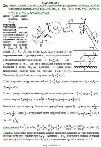 Механическая система состоит из грузов 1 и 2, ступенчатого шкива 3 с радиусами ступеней R3 = 0,3 м, r3 = 0,1 м и радиусом инерции относительно оси вращения ρ3 = 0,2 м, блока 4 радиуса R4 = 0,2 м и катка (или подвижного блока) 5 (рис. Д6.0 — Д6.9, табл. Д6); тело 5 считать сплошным однородным цилиндром, а массу блока 4 — равномерно распределенной по ободу. Коэффициент трения грузов о плоскость f = 0,1. Тела системы соединены друг с другом нитями, перекинутыми через блоки и намотанными на шкив 3 (или на шкив и каток); участки нитей параллельны соответствующим плоскостям. К одному из тел прикреплена пружина с коэффициентом жесткости c. Под действием силы F = f(s), зависящей от перемещения s точки ее приложения, система приходит в движение из состояния покоя; деформация пружины в момент начала движения равна нулю. При движении на шкив 3 действует постоянный момент М сил сопротивления (от трения в подшипниках). Определить значение искомой величины в тот момент времени, когда перемещение s станет равным s1 = 0,2 м. Искомая величина указана в столбце «Найти» таблицы, где обозначено: v1, v2, vC5 — скорости грузов 1, 2 и центра масс тела 5 соответственно, ω3 и ω4 — угловые скорости тел 3 и 4. Все катки, включая и катки, обмотанные нитями (как, например, каток 5 на рис. 2), катятся по плоскостям без скольжения. На всех рисунках не изображать груз 2, если m2 = 0; остальные тела должны изображаться и тогда, когда их масса равна нулю.