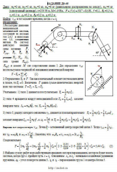 Механическая система состоит из грузов 1 и 2, ступенчатого шкива 3 с радиусами ступеней R3 = 0,3 м, r3 = 0,1 м и радиусом инерции относительно оси вращения ρ3 = 0,2 м, блока 4 радиуса R4 = 0,2 м и катка (или подвижного блока) 5 (рис. Д6.0 — Д6.9, табл. Д6); тело 5 считать сплошным однородным цилиндром, а массу блока 4 — равномерно распределенной по ободу. Коэффициент трения грузов о плоскость f = 0,1. Тела системы соединены друг с другом нитями, перекинутыми через блоки и намотанными на шкив 3 (или на шкив и каток); участки нитей параллельны соответствующим плоскостям. К одному из тел прикреплена пружина с коэффициентом жесткости c. Под действием силы F = f(s), зависящей от перемещения s точки ее приложения, система приходит в движение из состояния покоя; деформация пружины в момент начала движения равна нулю. При движении на шкив 3 действует постоянный момент М сил сопротивления (от трения в подшипниках). Определить значение искомой величины в тот момент времени, когда перемещение s станет равным s1 = 0,2 м. Искомая величина указана в столбце «Найти» таблицы, где обозначено: v1, v2, vC5 — скорости грузов 1, 2 и центра масс тела 5 соответственно, ω3 и ω4 — угловые скорости тел 3 и 4. Все катки, включая и катки, обмотанные нитями (как, например, каток 5 на рис. 2), катятся по плоскостям без скольжения. На всех рисунках не изображать груз 2, если m2 = 0; остальные тела должны изображаться и тогда, когда их масса равна нулю.