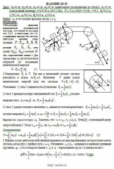 Механическая система состоит из грузов 1 и 2, ступенчатого шкива 3 с радиусами ступеней R3 = 0,3 м, r3 = 0,1 м и радиусом инерции относительно оси вращения ρ3 = 0,2 м, блока 4 радиуса R4 = 0,2 м и катка (или подвижного блока) 5 (рис. Д6.0 — Д6.9, табл. Д6); тело 5 считать сплошным однородным цилиндром, а массу блока 4 — равномерно распределенной по ободу. Коэффициент трения грузов о плоскость f = 0,1. Тела системы соединены друг с другом нитями, перекинутыми через блоки и намотанными на шкив 3 (или на шкив и каток); участки нитей параллельны соответствующим плоскостям. К одному из тел прикреплена пружина с коэффициентом жесткости c. Под действием силы F = f(s), зависящей от перемещения s точки ее приложения, система приходит в движение из состояния покоя; деформация пружины в момент начала движения равна нулю. При движении на шкив 3 действует постоянный момент М сил сопротивления (от трения в подшипниках). Определить значение искомой величины в тот момент времени, когда перемещение s станет равным s1 = 0,2 м. Искомая величина указана в столбце «Найти» таблицы, где обозначено: v1, v2, vC5 — скорости грузов 1, 2 и центра масс тела 5 соответственно, ω3 и ω4 — угловые скорости тел 3 и 4. Все катки, включая и катки, обмотанные нитями (как, например, каток 5 на рис. 2), катятся по плоскостям без скольжения. На всех рисунках не изображать груз 2, если m2 = 0; остальные тела должны изображаться и тогда, когда их масса равна нулю.