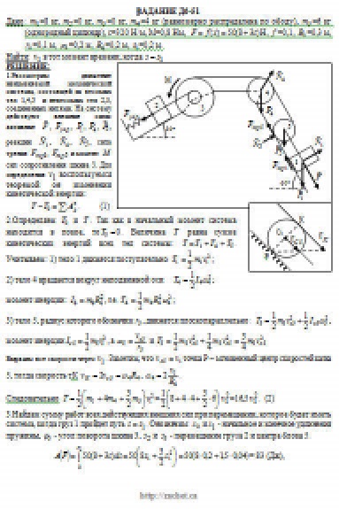 Механическая система состоит из грузов 1 и 2, ступенчатого шкива 3 с радиусами ступеней R3 = 0,3 м, r3 = 0,1 м и радиусом инерции относительно оси вращения ρ3 = 0,2 м, блока 4 радиуса R4 = 0,2 м и катка (или подвижного блока) 5 (рис. Д6.0 — Д6.9, табл. Д6); тело 5 считать сплошным однородным цилиндром, а массу блока 4 — равномерно распределенной по ободу. Коэффициент трения грузов о плоскость f = 0,1. Тела системы соединены друг с другом нитями, перекинутыми через блоки и намотанными на шкив 3 (или на шкив и каток); участки нитей параллельны соответствующим плоскостям. К одному из тел прикреплена пружина с коэффициентом жесткости c. Под действием силы F = f(s), зависящей от перемещения s точки ее приложения, система приходит в движение из состояния покоя; деформация пружины в момент начала движения равна нулю. При движении на шкив 3 действует постоянный момент М сил сопротивления (от трения в подшипниках). Определить значение искомой величины в тот момент времени, когда перемещение s станет равным s1 = 0,2 м. Искомая величина указана в столбце «Найти» таблицы, где обозначено: v1, v2, vC5 — скорости грузов 1, 2 и центра масс тела 5 соответственно, ω3 и ω4 — угловые скорости тел 3 и 4. Все катки, включая и катки, обмотанные нитями (как, например, каток 5 на рис. 2), катятся по плоскостям без скольжения. На всех рисунках не изображать груз 2, если m2 = 0; остальные тела должны изображаться и тогда, когда их масса равна нулю.
