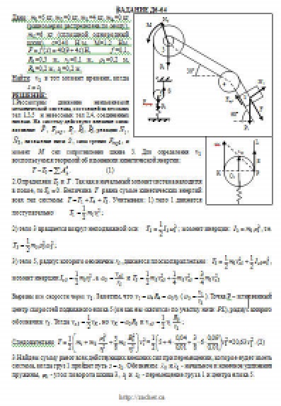 Механическая система состоит из грузов 1 и 2, ступенчатого шкива 3 с радиусами ступеней R3 = 0,3 м, r3 = 0,1 м и радиусом инерции относительно оси вращения ρ3 = 0,2 м, блока 4 радиуса R4 = 0,2 м и катка (или подвижного блока) 5 (рис. Д6.0 — Д6.9, табл. Д6); тело 5 считать сплошным однородным цилиндром, а массу блока 4 — равномерно распределенной по ободу. Коэффициент трения грузов о плоскость f = 0,1. Тела системы соединены друг с другом нитями, перекинутыми через блоки и намотанными на шкив 3 (или на шкив и каток); участки нитей параллельны соответствующим плоскостям. К одному из тел прикреплена пружина с коэффициентом жесткости c. Под действием силы F = f(s), зависящей от перемещения s точки ее приложения, система приходит в движение из состояния покоя; деформация пружины в момент начала движения равна нулю. При движении на шкив 3 действует постоянный момент М сил сопротивления (от трения в подшипниках). Определить значение искомой величины в тот момент времени, когда перемещение s станет равным s1 = 0,2 м. Искомая величина указана в столбце «Найти» таблицы, где обозначено: v1, v2, vC5 — скорости грузов 1, 2 и центра масс тела 5 соответственно, ω3 и ω4 — угловые скорости тел 3 и 4. Все катки, включая и катки, обмотанные нитями (как, например, каток 5 на рис. 2), катятся по плоскостям без скольжения. На всех рисунках не изображать груз 2, если m2 = 0; остальные тела должны изображаться и тогда, когда их масса равна нулю.