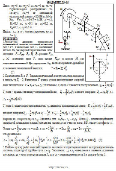 Механическая система состоит из грузов 1 и 2, ступенчатого шкива 3 с радиусами ступеней R3 = 0,3 м, r3 = 0,1 м и радиусом инерции относительно оси вращения ρ3 = 0,2 м, блока 4 радиуса R4 = 0,2 м и катка (или подвижного блока) 5 (рис. Д6.0 — Д6.9, табл. Д6); тело 5 считать сплошным однородным цилиндром, а массу блока 4 — равномерно распределенной по ободу. Коэффициент трения грузов о плоскость f = 0,1. Тела системы соединены друг с другом нитями, перекинутыми через блоки и намотанными на шкив 3 (или на шкив и каток); участки нитей параллельны соответствующим плоскостям. К одному из тел прикреплена пружина с коэффициентом жесткости c. Под действием силы F = f(s), зависящей от перемещения s точки ее приложения, система приходит в движение из состояния покоя; деформация пружины в момент начала движения равна нулю. При движении на шкив 3 действует постоянный момент М сил сопротивления (от трения в подшипниках). Определить значение искомой величины в тот момент времени, когда перемещение s станет равным s1 = 0,2 м. Искомая величина указана в столбце «Найти» таблицы, где обозначено: v1, v2, vC5 — скорости грузов 1, 2 и центра масс тела 5 соответственно, ω3 и ω4 — угловые скорости тел 3 и 4. Все катки, включая и катки, обмотанные нитями (как, например, каток 5 на рис. 2), катятся по плоскостям без скольжения. На всех рисунках не изображать груз 2, если m2 = 0; остальные тела должны изображаться и тогда, когда их масса равна нулю.