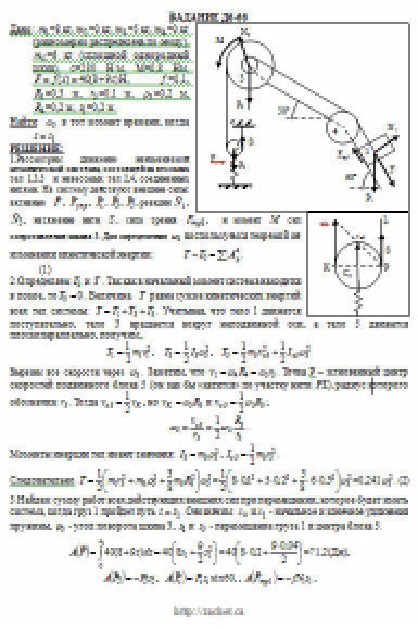 Механическая система состоит из грузов 1 и 2, ступенчатого шкива 3 с радиусами ступеней R3 = 0,3 м, r3 = 0,1 м и радиусом инерции относительно оси вращения ρ3 = 0,2 м, блока 4 радиуса R4 = 0,2 м и катка (или подвижного блока) 5 (рис. Д6.0 — Д6.9, табл. Д6); тело 5 считать сплошным однородным цилиндром, а массу блока 4 — равномерно распределенной по ободу. Коэффициент трения грузов о плоскость f = 0,1. Тела системы соединены друг с другом нитями, перекинутыми через блоки и намотанными на шкив 3 (или на шкив и каток); участки нитей параллельны соответствующим плоскостям. К одному из тел прикреплена пружина с коэффициентом жесткости c. Под действием силы F = f(s), зависящей от перемещения s точки ее приложения, система приходит в движение из состояния покоя; деформация пружины в момент начала движения равна нулю. При движении на шкив 3 действует постоянный момент М сил сопротивления (от трения в подшипниках). Определить значение искомой величины в тот момент времени, когда перемещение s станет равным s1 = 0,2 м. Искомая величина указана в столбце «Найти» таблицы, где обозначено: v1, v2, vC5 — скорости грузов 1, 2 и центра масс тела 5 соответственно, ω3 и ω4 — угловые скорости тел 3 и 4. Все катки, включая и катки, обмотанные нитями (как, например, каток 5 на рис. 2), катятся по плоскостям без скольжения. На всех рисунках не изображать груз 2, если m2 = 0; остальные тела должны изображаться и тогда, когда их масса равна нулю.