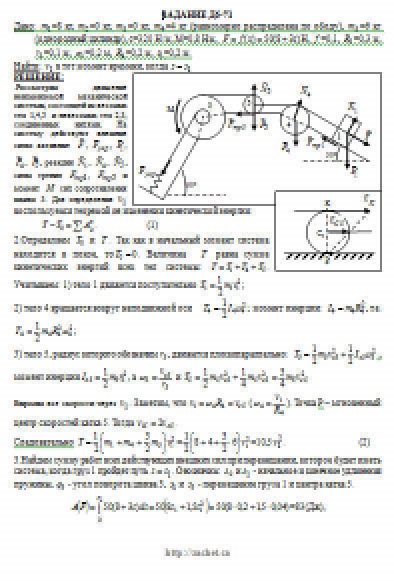 Механическая система состоит из грузов 1 и 2, ступенчатого шкива 3 с радиусами ступеней R3 = 0,3 м, r3 = 0,1 м и радиусом инерции относительно оси вращения ρ3 = 0,2 м, блока 4 радиуса R4 = 0,2 м и катка (или подвижного блока) 5 (рис. Д6.0 — Д6.9, табл. Д6); тело 5 считать сплошным однородным цилиндром, а массу блока 4 — равномерно распределенной по ободу. Коэффициент трения грузов о плоскость f = 0,1. Тела системы соединены друг с другом нитями, перекинутыми через блоки и намотанными на шкив 3 (или на шкив и каток); участки нитей параллельны соответствующим плоскостям. К одному из тел прикреплена пружина с коэффициентом жесткости c. Под действием силы F = f(s), зависящей от перемещения s точки ее приложения, система приходит в движение из состояния покоя; деформация пружины в момент начала движения равна нулю. При движении на шкив 3 действует постоянный момент М сил сопротивления (от трения в подшипниках). Определить значение искомой величины в тот момент времени, когда перемещение s станет равным s1 = 0,2 м. Искомая величина указана в столбце «Найти» таблицы, где обозначено: v1, v2, vC5 — скорости грузов 1, 2 и центра масс тела 5 соответственно, ω3 и ω4 — угловые скорости тел 3 и 4. Все катки, включая и катки, обмотанные нитями (как, например, каток 5 на рис. 2), катятся по плоскостям без скольжения. На всех рисунках не изображать груз 2, если m2 = 0; остальные тела должны изображаться и тогда, когда их масса равна нулю.