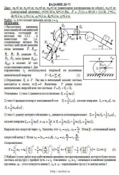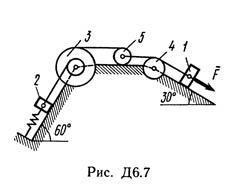 Механическая система состоит из грузов 1 и 2, ступенчатого шкива 3 с радиусами ступеней R3 = 0,3 м, r3 = 0,1 м и радиусом инерции относительно оси вращения ρ3 = 0,2 м, блока 4 радиуса R4 = 0,2 м и катка (или подвижного блока) 5 (рис. Д6.0 — Д6.9, табл. Д6); тело 5 считать сплошным однородным цилиндром, а массу блока 4 — равномерно распределенной по ободу. Коэффициент трения грузов о плоскость f = 0,1. Тела системы соединены друг с другом нитями, перекинутыми через блоки и намотанными на шкив 3 (или на шкив и каток); участки нитей параллельны соответствующим плоскостям. К одному из тел прикреплена пружина с коэффициентом жесткости c. Под действием силы F = f(s), зависящей от перемещения s точки ее приложения, система приходит в движение из состояния покоя; деформация пружины в момент начала движения равна нулю. При движении на шкив 3 действует постоянный момент М сил сопротивления (от трения в подшипниках). Определить значение искомой величины в тот момент времени, когда перемещение s станет равным s1 = 0,2 м. Искомая величина указана в столбце «Найти» таблицы, где обозначено: v1, v2, vC5 — скорости грузов 1, 2 и центра масс тела 5 соответственно, ω3 и ω4 — угловые скорости тел 3 и 4. Все катки, включая и катки, обмотанные нитями (как, например, каток 5 на рис. 2), катятся по плоскостям без скольжения. На всех рисунках не изображать груз 2, если m2 = 0; остальные тела должны изображаться и тогда, когда их масса равна нулю.
