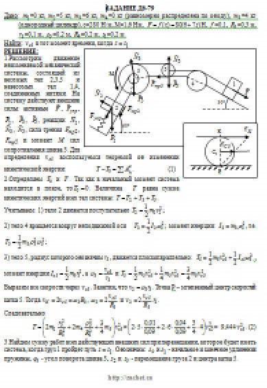 Механическая система состоит из грузов 1 и 2, ступенчатого шкива 3 с радиусами ступеней R3 = 0,3 м, r3 = 0,1 м и радиусом инерции относительно оси вращения ρ3 = 0,2 м, блока 4 радиуса R4 = 0,2 м и катка (или подвижного блока) 5 (рис. Д6.0 — Д6.9, табл. Д6); тело 5 считать сплошным однородным цилиндром, а массу блока 4 — равномерно распределенной по ободу. Коэффициент трения грузов о плоскость f = 0,1. Тела системы соединены друг с другом нитями, перекинутыми через блоки и намотанными на шкив 3 (или на шкив и каток); участки нитей параллельны соответствующим плоскостям. К одному из тел прикреплена пружина с коэффициентом жесткости c. Под действием силы F = f(s), зависящей от перемещения s точки ее приложения, система приходит в движение из состояния покоя; деформация пружины в момент начала движения равна нулю. При движении на шкив 3 действует постоянный момент М сил сопротивления (от трения в подшипниках). Определить значение искомой величины в тот момент времени, когда перемещение s станет равным s1 = 0,2 м. Искомая величина указана в столбце «Найти» таблицы, где обозначено: v1, v2, vC5 — скорости грузов 1, 2 и центра масс тела 5 соответственно, ω3 и ω4 — угловые скорости тел 3 и 4. Все катки, включая и катки, обмотанные нитями (как, например, каток 5 на рис. 2), катятся по плоскостям без скольжения. На всех рисунках не изображать груз 2, если m2 = 0; остальные тела должны изображаться и тогда, когда их масса равна нулю.