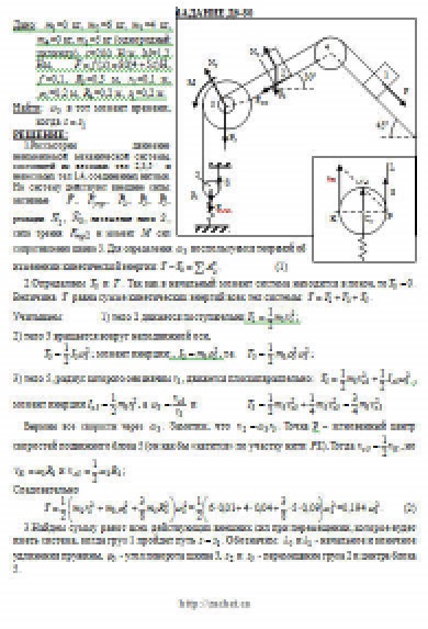 Механическая система состоит из грузов 1 и 2, ступенчатого шкива 3 с радиусами ступеней R3 = 0,3 м, r3 = 0,1 м и радиусом инерции относительно оси вращения ρ3 = 0,2 м, блока 4 радиуса R4 = 0,2 м и катка (или подвижного блока) 5 (рис. Д6.0 — Д6.9, табл. Д6); тело 5 считать сплошным однородным цилиндром, а массу блока 4 — равномерно распределенной по ободу. Коэффициент трения грузов о плоскость f = 0,1. Тела системы соединены друг с другом нитями, перекинутыми через блоки и намотанными на шкив 3 (или на шкив и каток); участки нитей параллельны соответствующим плоскостям. К одному из тел прикреплена пружина с коэффициентом жесткости c. Под действием силы F = f(s), зависящей от перемещения s точки ее приложения, система приходит в движение из состояния покоя; деформация пружины в момент начала движения равна нулю. При движении на шкив 3 действует постоянный момент М сил сопротивления (от трения в подшипниках). Определить значение искомой величины в тот момент времени, когда перемещение s станет равным s1 = 0,2 м. Искомая величина указана в столбце «Найти» таблицы, где обозначено: v1, v2, vC5 — скорости грузов 1, 2 и центра масс тела 5 соответственно, ω3 и ω4 — угловые скорости тел 3 и 4. Все катки, включая и катки, обмотанные нитями (как, например, каток 5 на рис. 2), катятся по плоскостям без скольжения. На всех рисунках не изображать груз 2, если m2 = 0; остальные тела должны изображаться и тогда, когда их масса равна нулю.