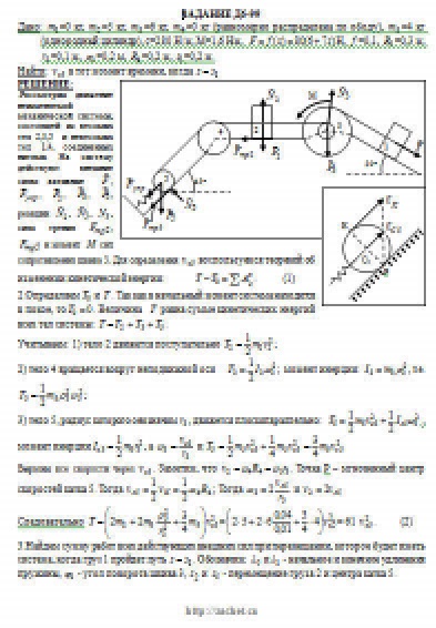 Механическая система состоит из грузов 1 и 2, ступенчатого шкива 3 с радиусами ступеней R3 = 0,3 м, r3 = 0,1 м и радиусом инерции относительно оси вращения ρ3 = 0,2 м, блока 4 радиуса R4 = 0,2 м и катка (или подвижного блока) 5 (рис. Д6.0 — Д6.9, табл. Д6); тело 5 считать сплошным однородным цилиндром, а массу блока 4 — равномерно распределенной по ободу. Коэффициент трения грузов о плоскость f = 0,1. Тела системы соединены друг с другом нитями, перекинутыми через блоки и намотанными на шкив 3 (или на шкив и каток); участки нитей параллельны соответствующим плоскостям. К одному из тел прикреплена пружина с коэффициентом жесткости c. Под действием силы F = f(s), зависящей от перемещения s точки ее приложения, система приходит в движение из состояния покоя; деформация пружины в момент начала движения равна нулю. При движении на шкив 3 действует постоянный момент М сил сопротивления (от трения в подшипниках). Определить значение искомой величины в тот момент времени, когда перемещение s станет равным s1 = 0,2 м. Искомая величина указана в столбце «Найти» таблицы, где обозначено: v1, v2, vC5 — скорости грузов 1, 2 и центра масс тела 5 соответственно, ω3 и ω4 — угловые скорости тел 3 и 4. Все катки, включая и катки, обмотанные нитями (как, например, каток 5 на рис. 2), катятся по плоскостям без скольжения. На всех рисунках не изображать груз 2, если m2 = 0; остальные тела должны изображаться и тогда, когда их масса равна нулю.