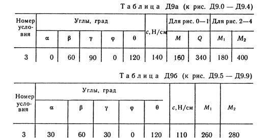 Механизм, расположенный в горизонтальной плоскости, находится под действием приложенных сил в равновесии; положение равновесия определяется углами α, β, γ, φ, θ (рис. Д9.0 — Д9.9, табл. Д9а и Д9б). Длины стержней механизма (кривошипов) равны: l1 = 0,4 м, l4 = 0,6 м (размеры l2 и l3 произвольны); точка Е находится в середине соответствующего стержня. На ползун В механизма действует сила упругости пружины F; численно F = сλ, где с — коэффициент жесткости пружины, λ — ее деформация. Кроме того, на рис. 0 и 1 на ползун D действует сила Q, а на кривошип O1А — пара сил с моментом М; на рис. 2—9 на кривошипы O1А и O2D действуют пары сил с моментами М1 и M2. Определить, чему равна при равновесии деформация λ пружины, и указать, растянута пружина или сжата. Значения всех заданных величин приведены в табл. Д9а для рис. 0—4 и в табл. Д9б для рис. 5—9, где Q выражено в ньютонах, а М, М1, М2 — в ньютонометрах. Построение чертежа начинать со стержня, направление которого определяется углом α; для большей наглядности ползун с направляющими и пружину изобразить так, как в примере Д9 (см. рис. Д9, а также рис. Д9.10, б). Если на чертеже решаемого варианта задачи прикрепленный к ползуну В стержень окажется совмещенным с пружиной (как на рис. Д9.10, а), то пружину следует считать прикрепленной к ползуну с другой стороны (как на рис. Д9.10, б, где одновременно иначе изображены направляющие).