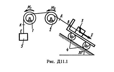 Механическая система состоит из тел 1, 2, …, 5 весом P1, Р2, …, P5 соответственно, связанных друг с другом нитями, намотанными на ступенчатые блоки 1 и 2 (рис. Д11.0 — Д11.9, табл. Д11). Радиусы ступенчатых блоков 1 и 2 равны соответственно R1 = R, r1 = 0,4R, R2 = R, r2 = 0,8R. При вычислении моментов инерции все блоки, катки и колеса считать однородными сплошными цилиндрами радиуса R. На систему кроме сил тяжести действует сила F, приложенная к телу 3 или 4 (если тело 3 в систему не входит, сила приложена в точке В к тележке), и пары сил с моментами М1, M2, приложенные к блокам 1 и 2; когда М<0, направление момента противоположно показанному на рисунке. На участке нити, указанном в таблице в столбце «Пружина», включена пружина с коэффициентом жесткости с (например, если в столбце стоит АВ, то участок АВ является пружиной, если AD, то AD — пружина и т.д.); в начальный момент времени пружина не деформирована. Составить для системы уравнения Лагранжа и найти закон изменения обобщенной координаты x, т. е. x = f(t), считая, что движение начинается из состояния покоя; определить также частоту и период колебаний, совершаемых телами системы при ее движении (о выборе координаты x см. «Указания»). Прочерк в столбцах таблицы, где заданы веса, означает, что соответствующее тело в систему не входит (на чертеже не изображать), а ноль — что тело считается невесомым, но в систему входит; для колес, обозначенных номером 4, Р4 — их общий вес (вес платформы такой тележки не учитывается).