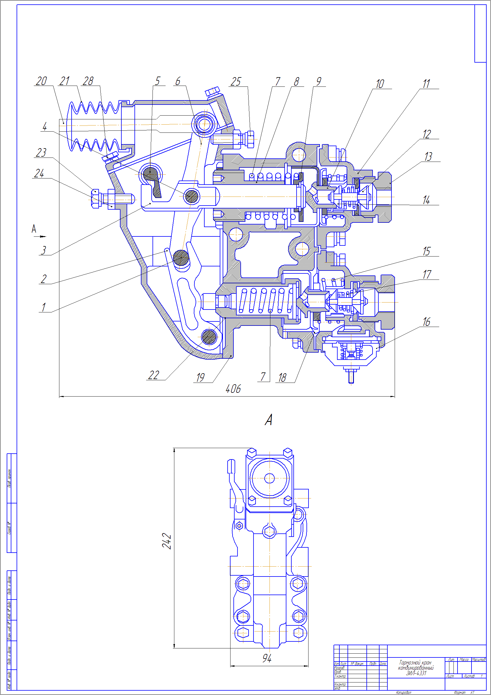 Тормозной кран комбинированный автомобиля ЗИЛ-4331. Сборочный чертеж. Спецификация.