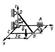 Однородная плита ОАВС весом G = 30Н удерживается в горизонтальном положении шарнирами О, А и тросом BD. Определить натяжение троса, если а = 2 м и угол ? = 60° (Ответ 30)