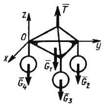 Определить натяжение каната Т в кН, если к нему прикреплена треугольная платформа весом G1 = 0,5 кН с грузами G2 = 10 кН, G3 = 6 кН и G4 = 8 кН. (Ответ 24,5)