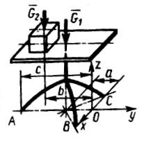 На треноге АВ=ВС=АС покоится гори­зонтальная платформа с грузом G2 = 50Н. Вес треноги и платформы G1 = 500Н. Векторы сил G1, G2 и точка A находятся в одной верти­кальной плоскости. Определить реакцию в точке А, если расстояния а = 0,5м, b = 1м и с = 1,5 м. (Ответ 200)