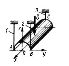 Однородная оболочка весом G = 40 кН в виде полуцилиндра радиуса R висит на трех вертикальных тросах 1, 2 и 3, закрепленных в точках А, В и С. Определить в кН реакцию в тросе 1, если известно, что реакция в тросе 3 равна 20 кН. (Ответ 10)