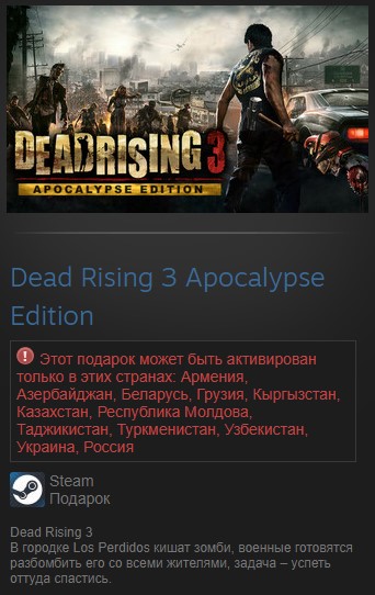 • Этот подарок может быть активирован только в этих странах: Армения, Азербайджан, Республика Беларусь, Грузия, Киргизстан, Казахстан, Республика Молдова, Таджикистан, Туркменистан, Узбекистан, Украина, РоссияНазвание: Dead Rising 3 Apocalypse Edition
