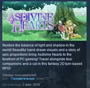 Beautiful hand-drawn visuals and a story of epic proportions bring Asdivine Hearts to the forefront of PC gaming! Travel alongside four companions and a cat in the adventure of a lifetime and one that transcends even the world in this fantasy 2D turn-based RPG!