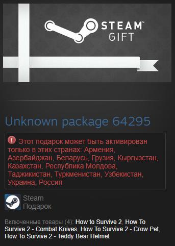 • Этот подарок может быть активирован только в этих странах: Армения, Азербайджан, Республика Беларусь, Грузия, Киргизстан, Казахстан, Республика Молдова, Таджикистан, Туркменистан, Узбекистан, Украина, РоссияНазвание: How to Survive 2